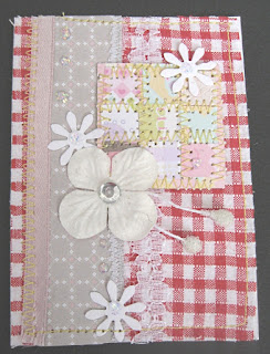 Фоном АТС сделала ткань розовых и красных расцветок. Из детской бумаги собрала маленькие коллажи. Все прошила на машинке и украсила цветочками, ленточками, тычинками. Для блеска немного клея с блёстками Stickles™ Glitter Glue .